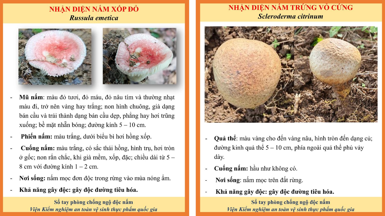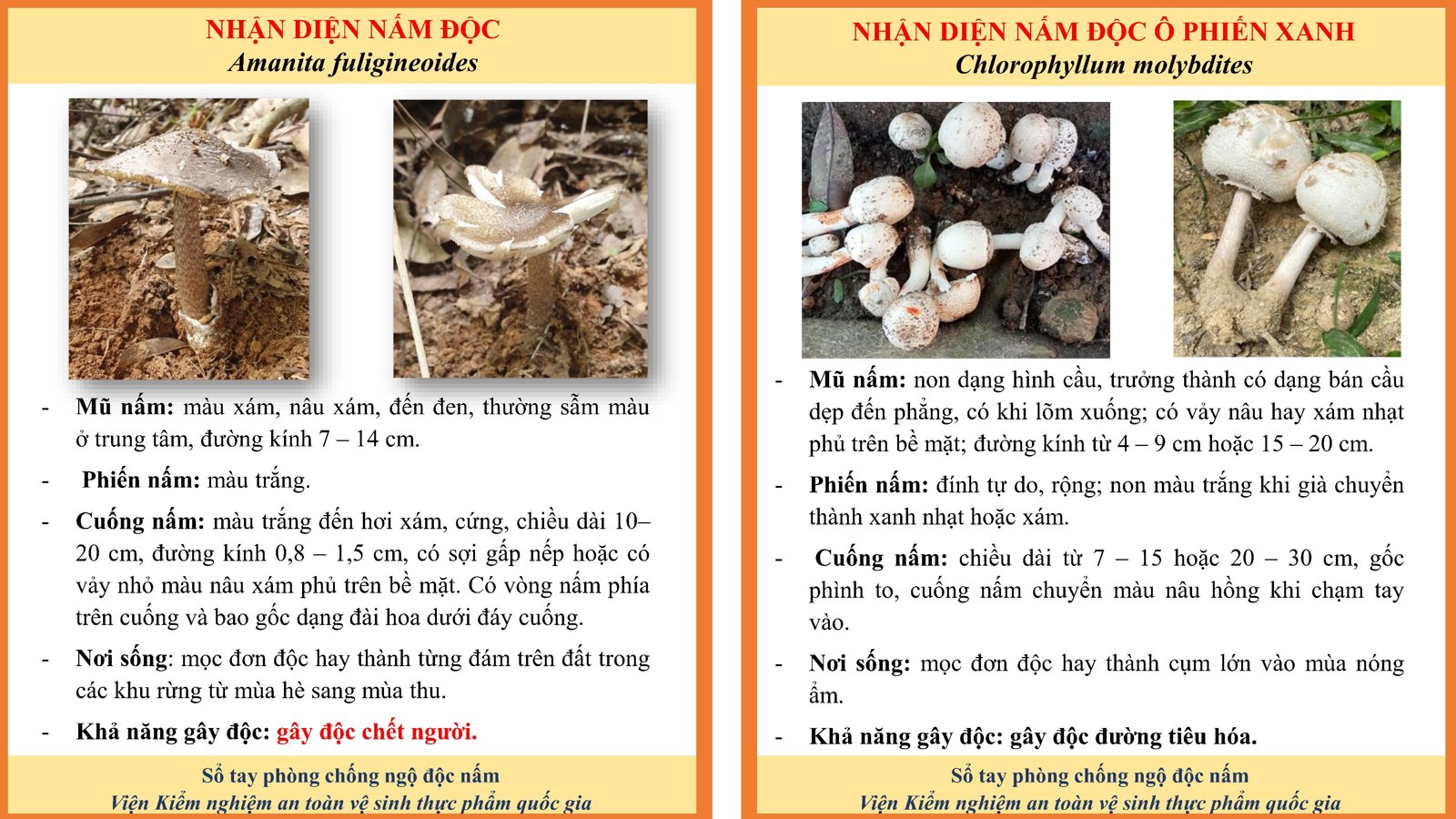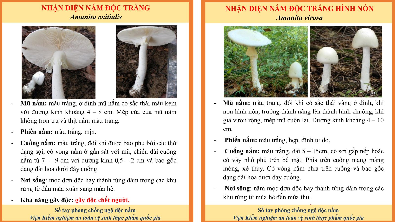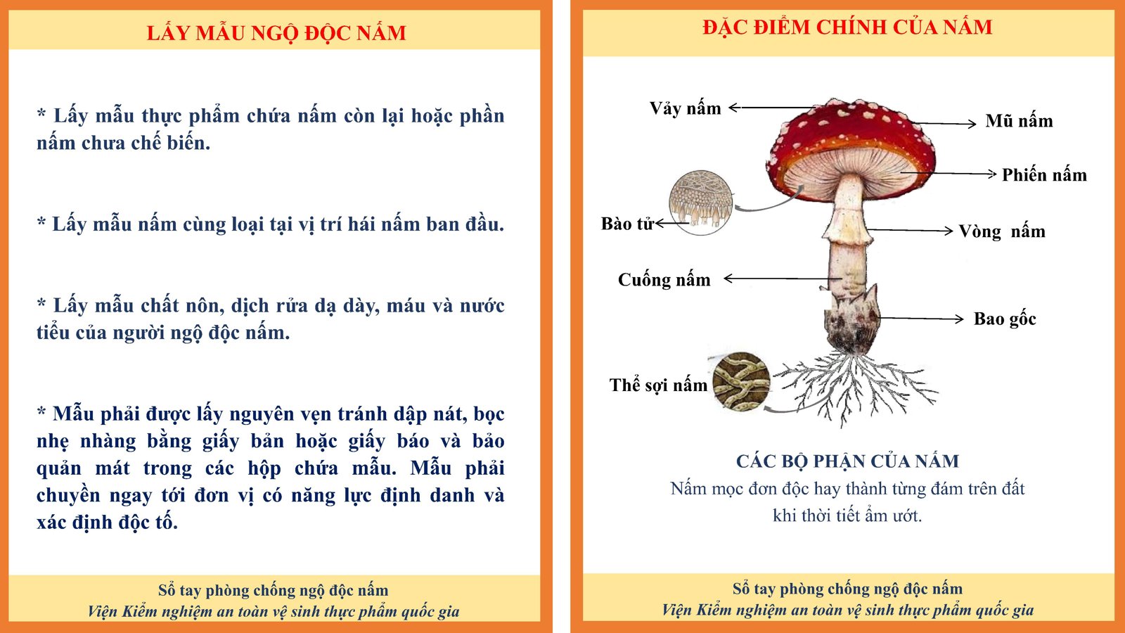 🧪 2. NHỮNG SAI LẦM CHẾT NGƯỜI CẦN BỎ NGAY ❌ "Nấm sặc sỡ mới độc": Sai! Nấm trắng, trông hiền lành vẫn có thể là nấm độc nhất. ❌ "Sâu bọ ăn được thì người ăn được": Sai! Tất cả các loại nấm đều có thể bị sâu bọ, ốc sên ăn. ❌ "Thử bằng thìa bạc, đũa bạc": Sai! Độc tố nấm không làm bạc đổi màu. ❌ "Cho động vật ăn thử trước": Sai! Có những loại nấm sau 4-5 ngày động vật mới chết, lúc đó con người đã bị nhiễm độc sâu. 🛡️ 3. CÁCH PHÒNG TRÁNH AN TOÀN ✅ Chỉ ăn nấm khi biết chính xác là nấm ăn được. ✅ Tuyệt đối không ăn nấm lạ, nấm hoang dại, nấm chưa xòe mũ. ✅ Không ăn nấm dập nát, ôi thiu (có thể sinh độc tố mới). ✅ Không tin vào kinh nghiệm dân gian chưa được kiểm chứng. 🆘 XỬ TRÍ KHI NGHI NGỜ NGỘ ĐỘC 🤮Nhanh chóng gây nôn nếu bệnh nhân còn tỉnh táo. 🚑Đưa ngay người bệnh (và những người cùng ăn) đến cơ sở y tế gần nhất. Lưu ý: 🍄 Mang theo mẫu nấm hoặc chất nôn để bác sĩ xác định loại độc tố nhanh nhất.