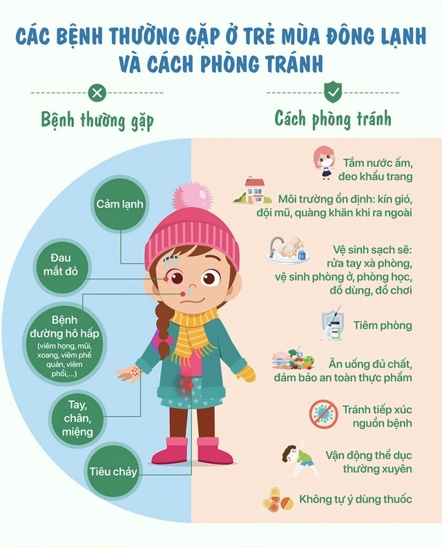 Thời tiết đang bước vào đợt rét đậm, rét hại rất sâu. Với trẻ nhỏ, hệ miễn dịch còn non nớt nên rất dễ mắc các bệnh về đường hô hấp và tiêu hóa. Để con yêu luôn khỏe mạnh qua mùa đông này, Bệnh viện Đa khoa số 3 tỉnh Lào Cai xin gửi các bậc cha mẹ "bí kíp" chăm sóc trẻ cực kỳ đơn giản và hiệu quả sau đây: 🧣 1. GIỮ ẤM ĐÚNG CÁCH – "4 ẤM 1 LẠNH" Đừng mặc quá nhiều áo dày cộm khiến con khó vận động. Hãy nhớ nguyên tắc: 4 ẤM: Giữ ấm bàn tay, bàn chân, ngực và bụng. 🧤🧦 1 LẠNH: Để hở phần đầu để không khí lưu thông (nếu trẻ đang sốt hoặc ở trong nhà kín), nhưng khi ra ngoài phải đội mũ len che tai nhé! 🧢 Mặc nhiều lớp: Giúp dễ dàng cởi bớt khi trẻ chạy nhảy ra mồ hôi, tránh mồ hôi thấm ngược gây viêm phổi.