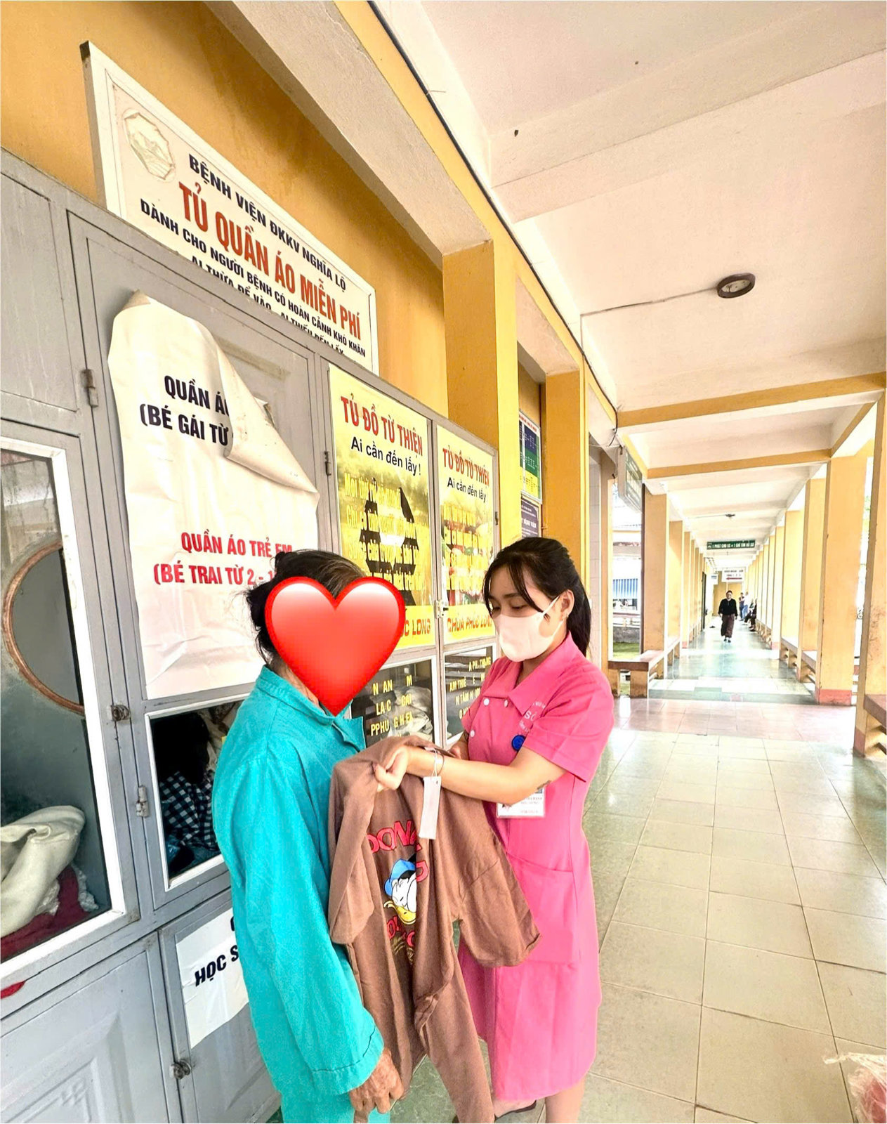Đồng thời, "Tủ áo ấm tình thương" đặt tại khoa Khám bệnh thường xuyên tiếp nhận, phân loại và tặng quần áo do các mạnh thường quân ủng hộ tới người bệnh.