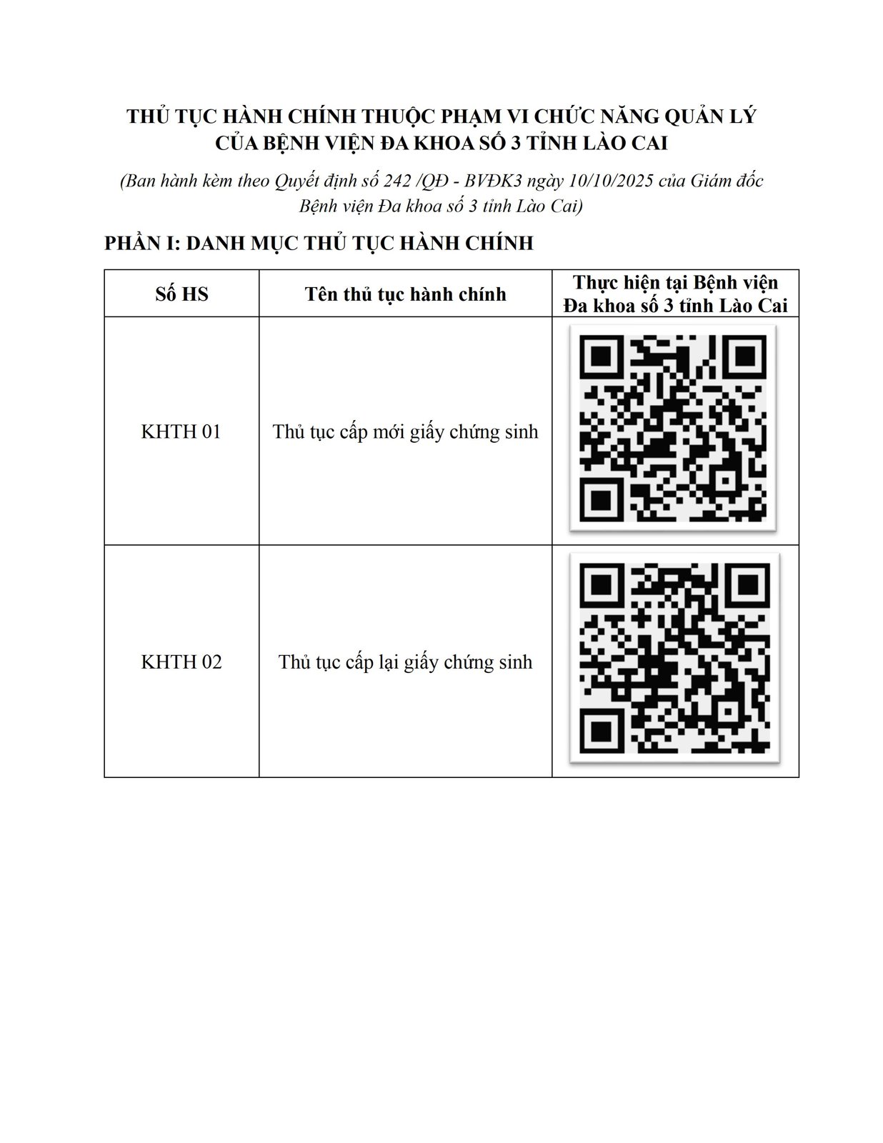 THỦ TỤC HÀNH CHÍNH THUỘC PHẠM VI CHỨC NĂNG QUẢN LÝ CỦA BỆNH VIỆN ĐA KHOA SỐ 3 TỈNH LÀO CAI